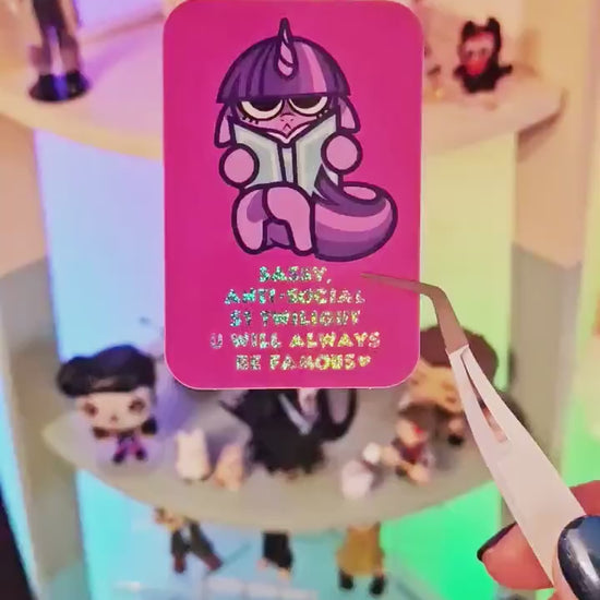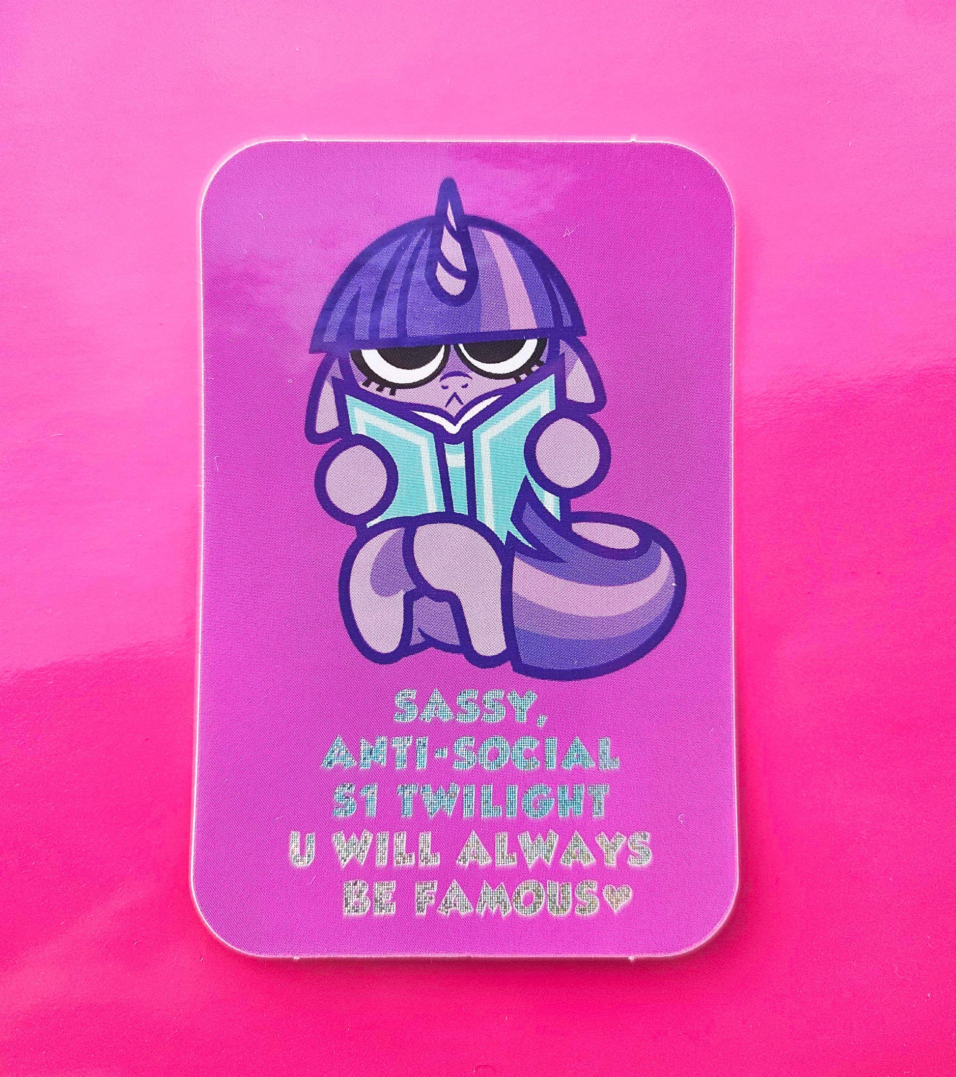 A 2" x 3" vinyl sticker of Twilight Sparkle with glittery font.